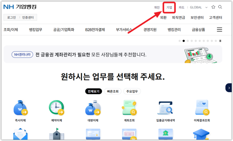 - 또는 NH농협은행 공식 웹사이트에 접속해서 인터넷뱅킹 메뉴를 찾아도 됩니다.