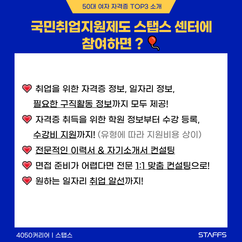 50대 여성분들이 새로운 시작을 위해 고려할 만한 유망 자격증들을 핵심만 쏙쏙 뽑아 정리해 보았어요.