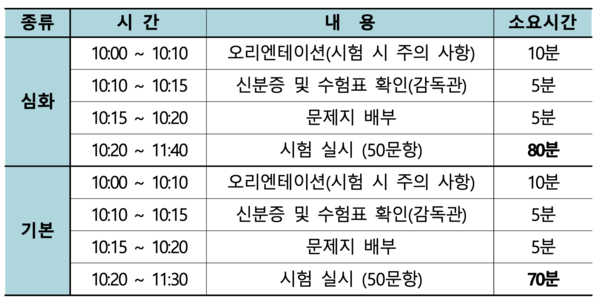 시험은 50문항 객관식으로 출제되고, 심화는 5지선다, 기본은 4지선다 형식이에요. 제가 아래 표로 상세한 시험 시간표를 정리해 드릴게요.