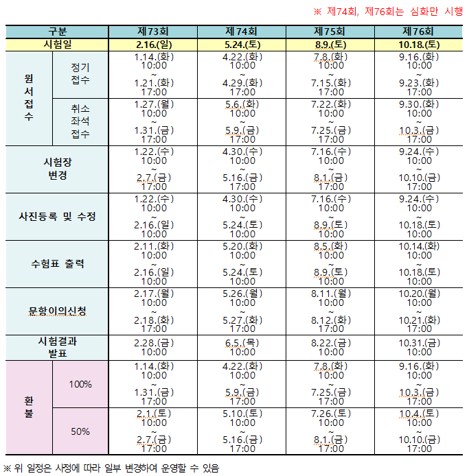 아래 표로 제76회 한국사 능력검정시험의 주요 일정을 정리해 봤어요. 접수 기간을 놓치지 않도록 미리 달력에 표시해 두는 것이 좋겠죠?