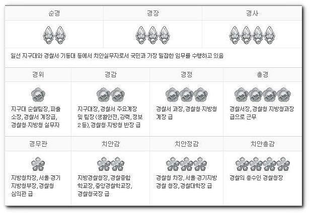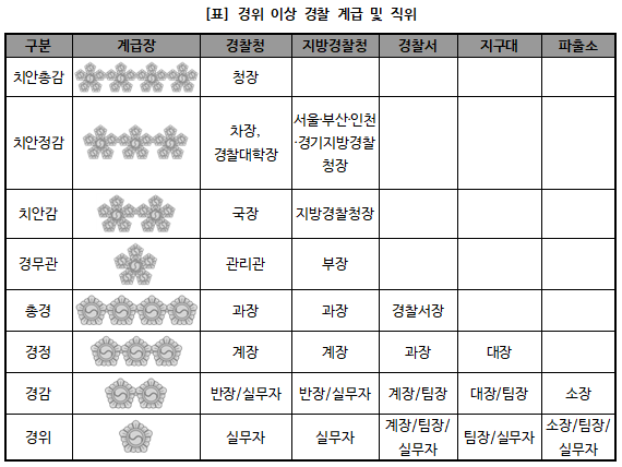 - 경정~경위: 각 부서의 팀장, 파트장, 주요 실무 책임자로서 중요한 실무를 맡습니다.
