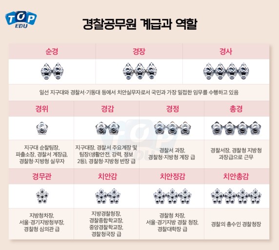 - 경사~순경: 실무 중심의 현장 경찰관으로, 국민의 안전과 치안 유지를 위해 최일선에서 활동합니다.