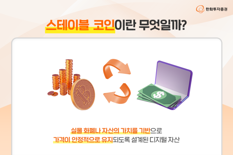 스테이블 코인(Stablecoin)은 이름 그대로 '안정적'인 가치를 지닌 디지털 화폐를 말해요. 비트코인처럼 가격이 크게 오르내리지 않고, 특정 법정화폐(달러, 원화 등)나 실물 자산(금, 채권)의 가치에 연동되어 있답니다.