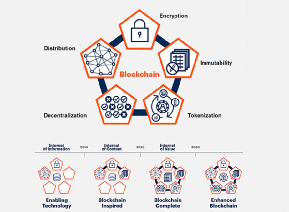 블록체인의 탈중앙화, 투명성, 불변성, 보안성을 상징하는 아이콘들