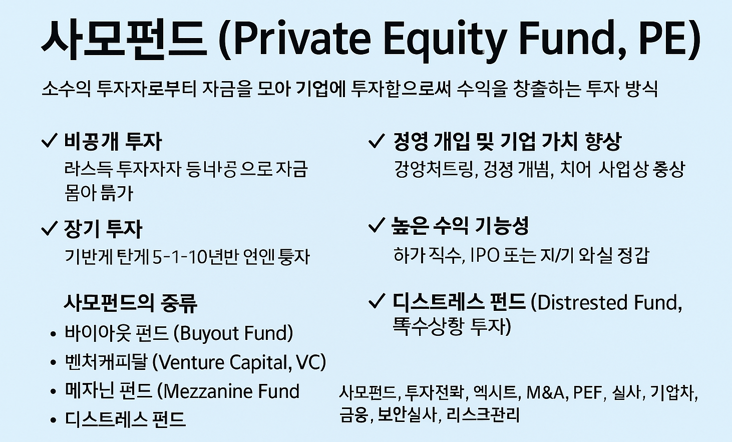 지금까지 사모펀드에 대해 자세히 알아보았는데요, 중요 내용을 한눈에 보기 쉽게 정리해 드릴게요!